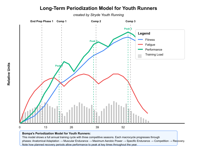 This model applies to all athletes, but with younger runners there are special considerations. For young people, their bodies are already devoting significant energy and resources to growth and development, and they don’t have the physical capacity and resilience to train like adults.